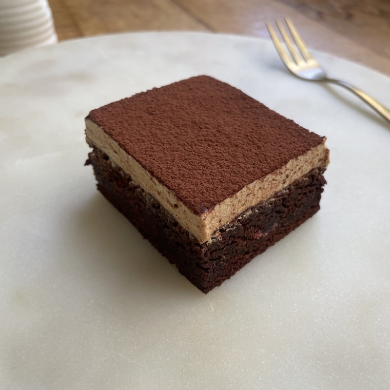 Dense, fudgy chocolate brownie layered with smooth espresso-style cream and finished with a fine cocoa dusting.